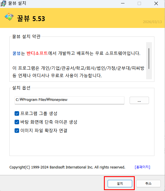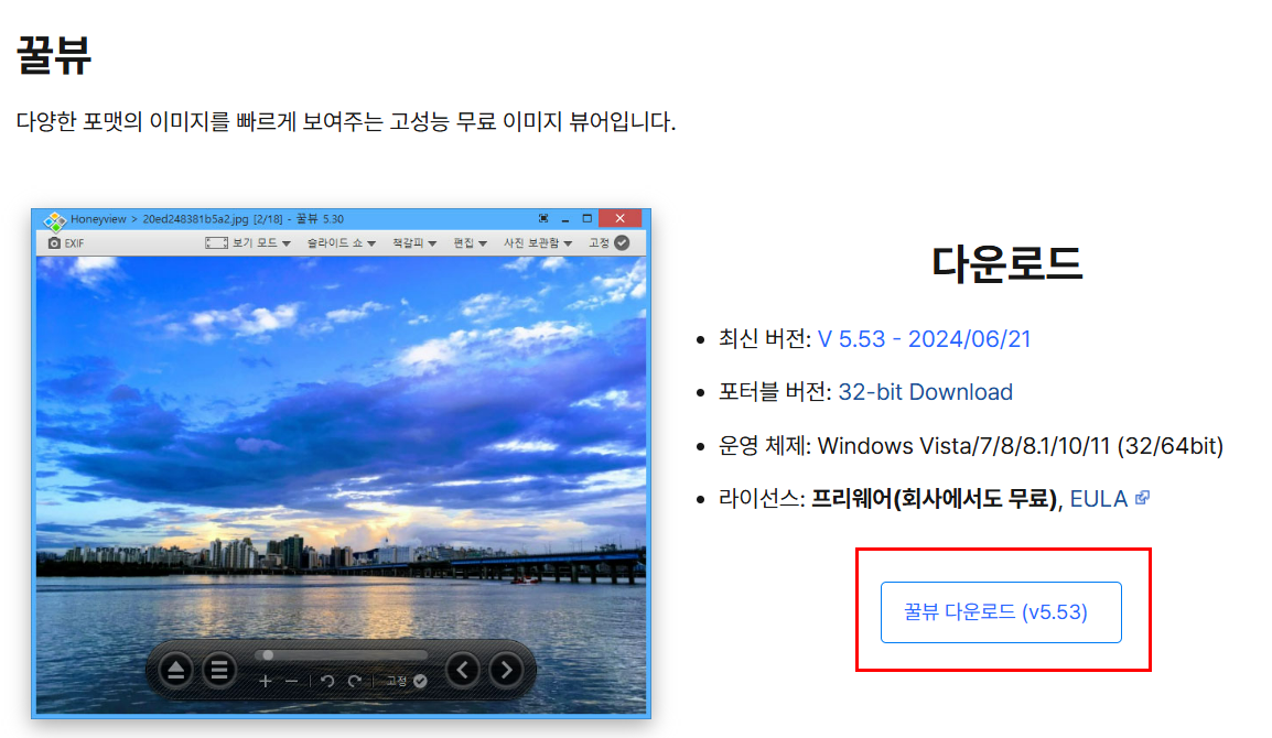 지금 안내해드리는 경로를 통해 공식 웹사이트에서 제공하는 꿀뷰 설치 파일을 빠르게 이용하실 수 있습니다.